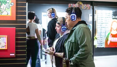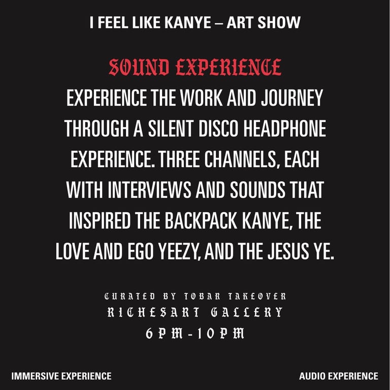 Experience the work and journey through a silent disco headphone experience. Three channels, each curated with interviews and sounds that inspired the backpack Kanye, the love and ego Yeezy, and the Jesus ye.
