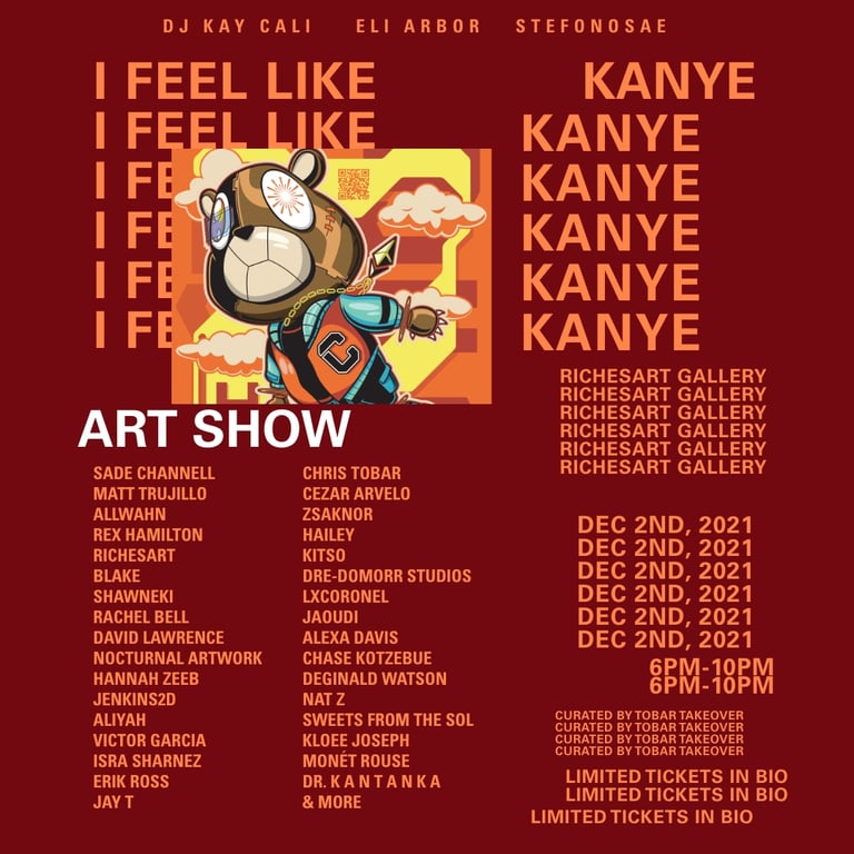 I feel like Kanye – An art show paying tribute to KanyeWest. Over 30 artists were invited to re-imagine their favorite songs from one of the world’s most prolific artists. More than an ART SHOW, this immersive experience includes an indoor audio experience, an outdoor stage with 3 DJs, and oversize video projection. The show seeks to honor the impact his music, vision, and fashion have affected us as fans and artists. Let’s give our inspiration to their flowers while they are here.
