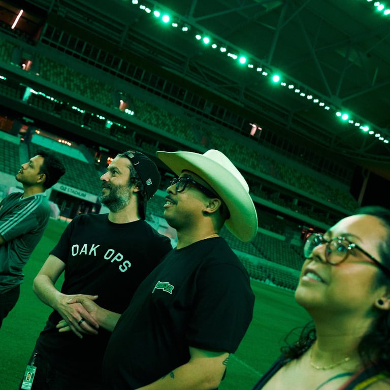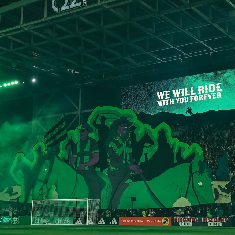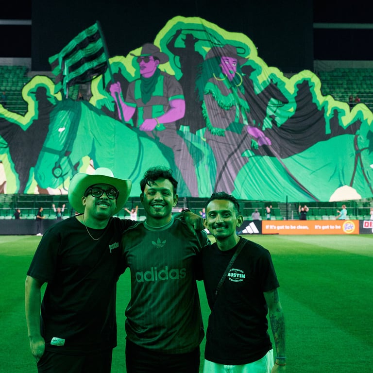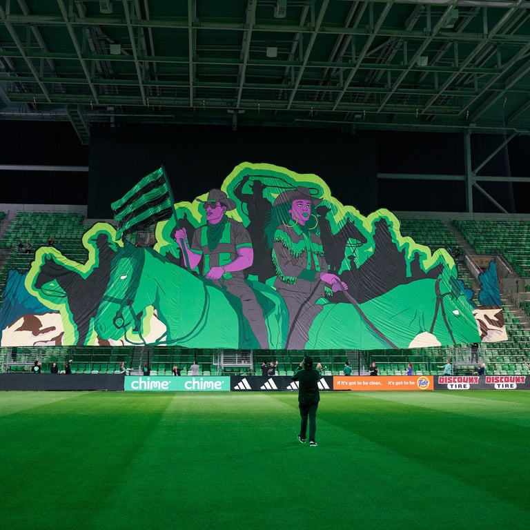 A season-opening tifo honoring the legacy of Black cowboys and cowgirls, inspired by the Black Cowboy Museum in Rosenberg, Texas. Led by Tobar, Marcos Morales, and Rico Hernandez, the piece spans 4,000 square feet and was brought to life through 1,000+ volunteer hours from the Verde community—transforming history into a powerful, collective visual statement.
