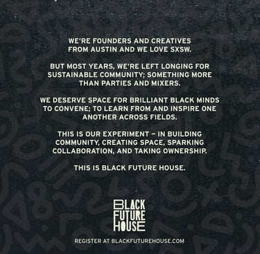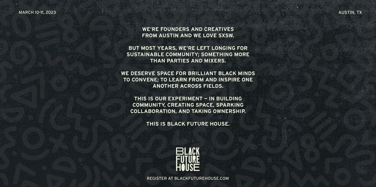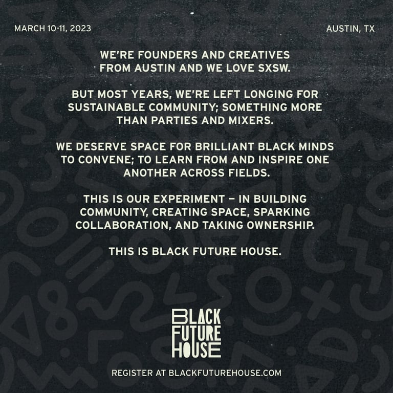 Black Future House, an Austin-based community dedicated to cultivating collaboration, creativity, and inclusivity for Black futurists, sought a dynamic brand identity that reflects its innovative and inclusive spirit. The brand should be modern, creative, and visually appealing, resonating with the diverse community of Black futurists. Launched at SXSW 23.